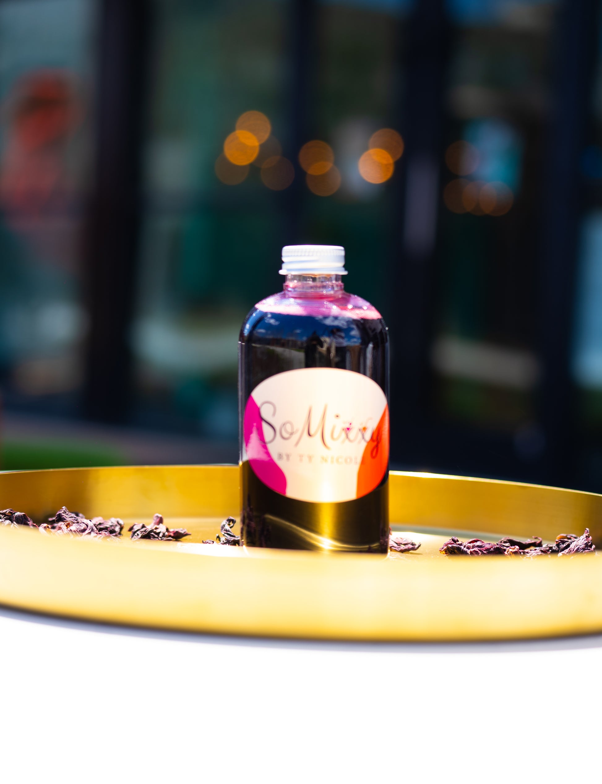 The Hibiscus Cocktail Syrup is a homemade batch-produced syrup crafted with the vibrant flavors of handpicked hibiscus flowers, balanced with a symphony of spices. Each batch captures the essence of Hibiscus blossoms with a harmonious blend of aromatic spices.